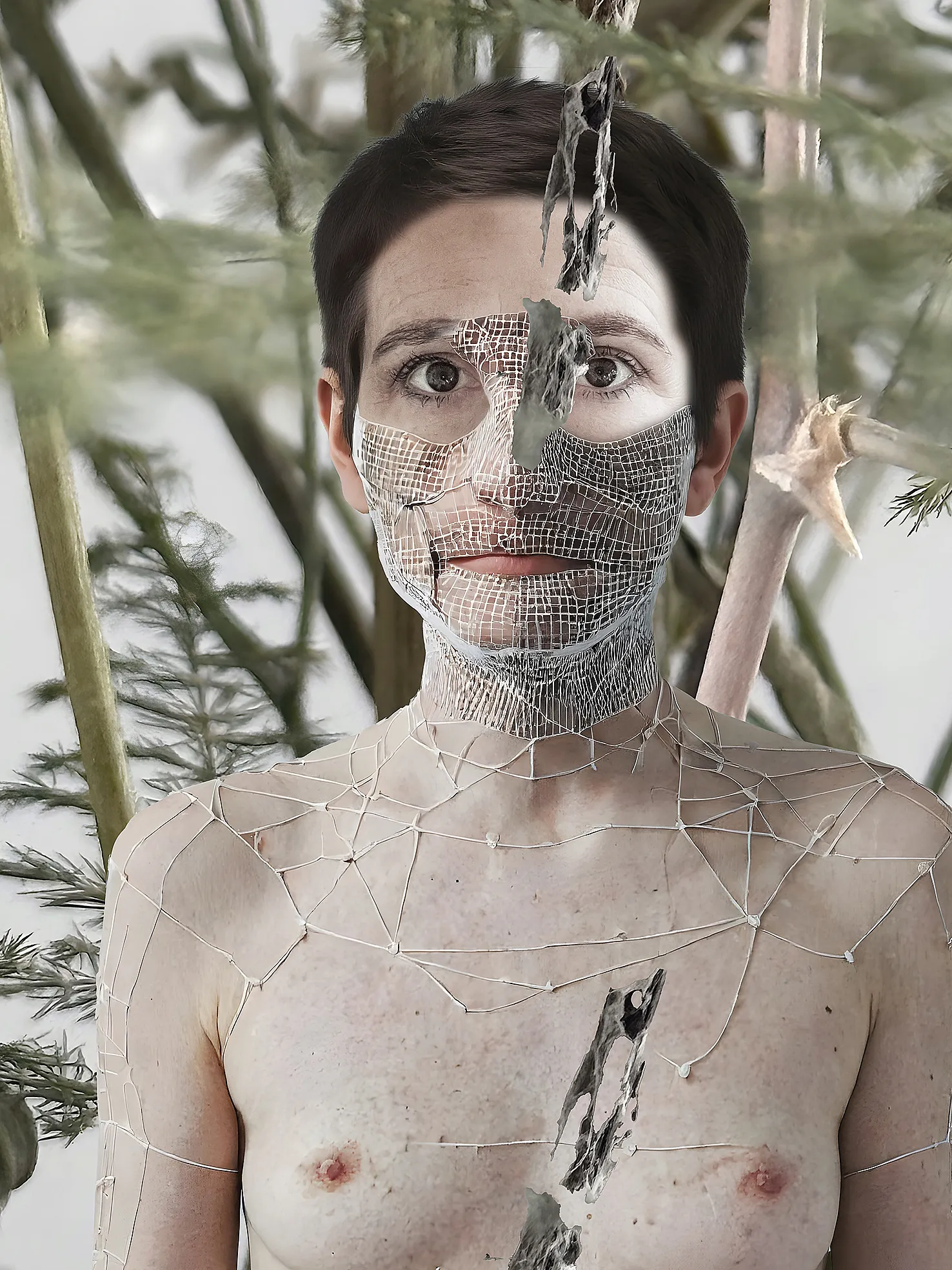 Ein Selbstportrait zwischen natürlichen Strukturen und digitaler Vermessung. Eine netzartige algorithmische Struktur, die sich an ausgewiesenen Stellen wie selbstverständlich über den Oberkörper und das Gesicht gelegt hat, verweist auf Codes, Erkennungssysteme und Markierungen. Doch die gesamte Struktur ist punktuell beschädigt, partiell bereits aufgelöst und dabei überaus verletzlich. Der persönliche Rückzug aus einem System bei gleichzeitiger Offenlegung von systemischen Prozessen – ein Spannungsverhältnis zwischen äußerer Vorstellungskraft und einer sich dazu verhaltenen inneren Unverfügbarkeit.