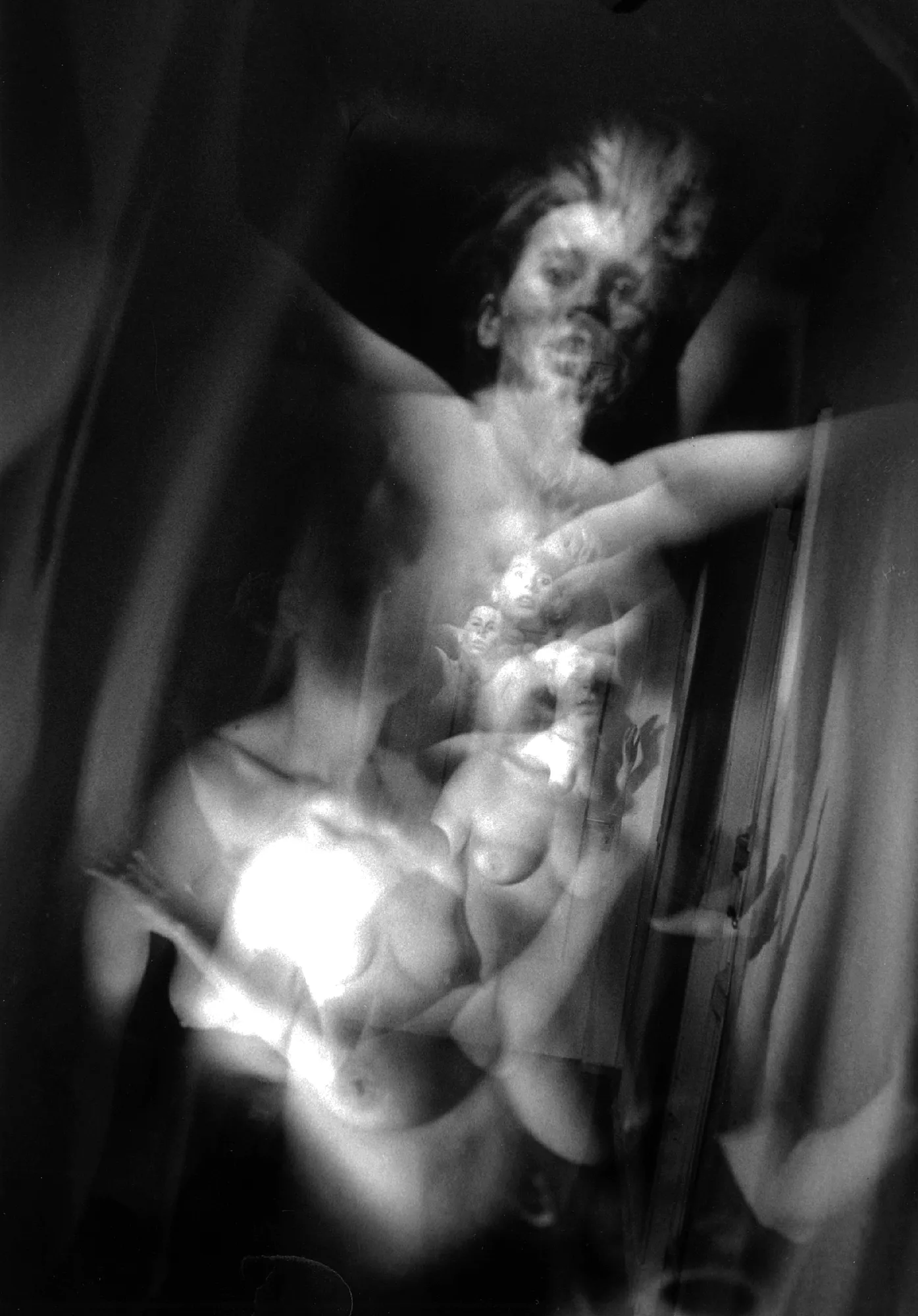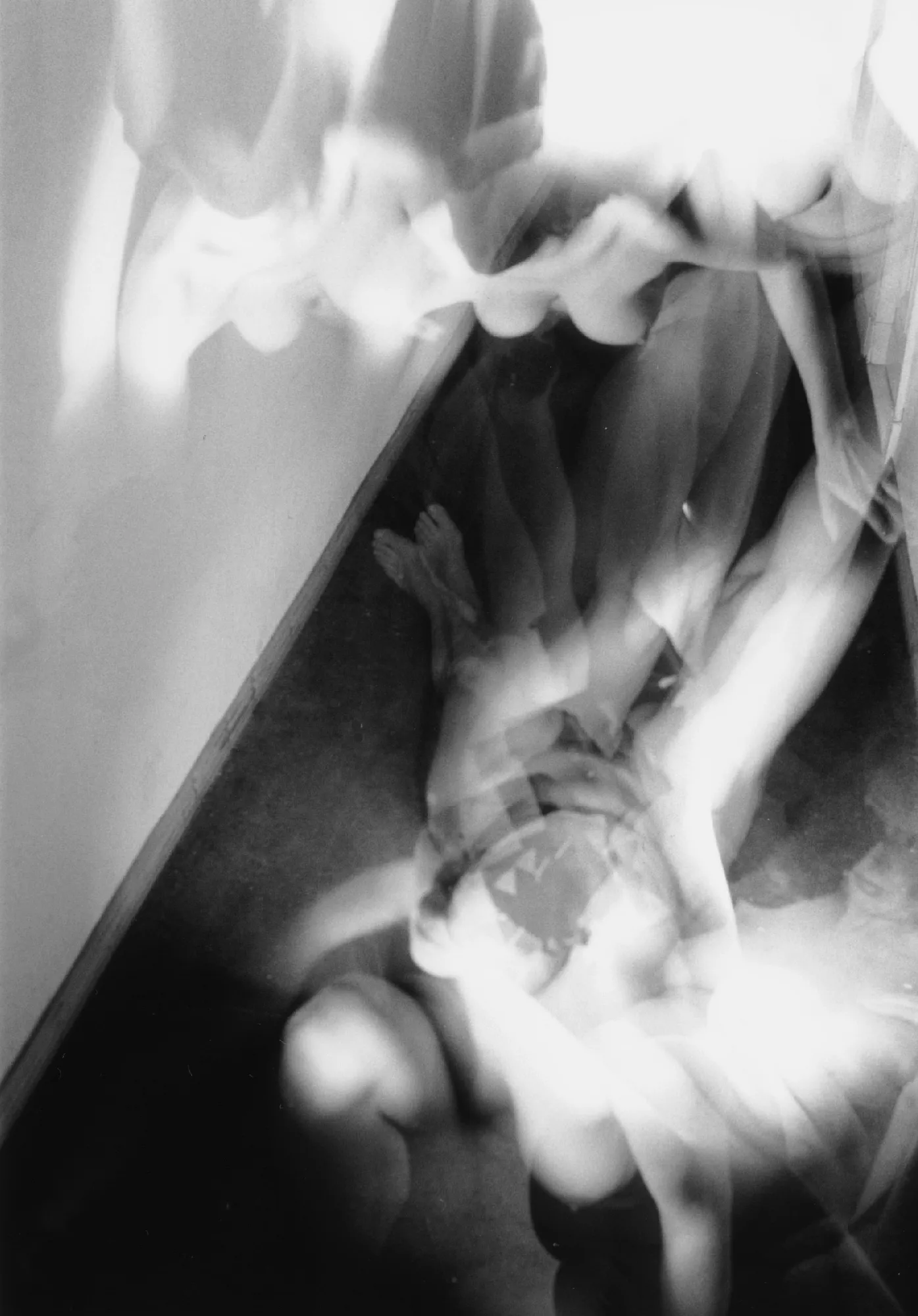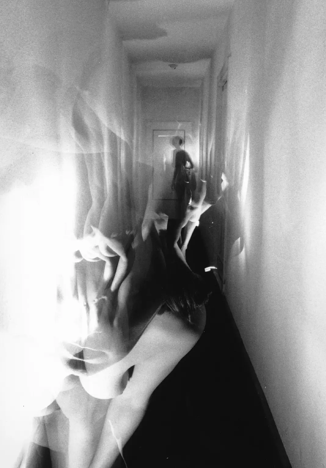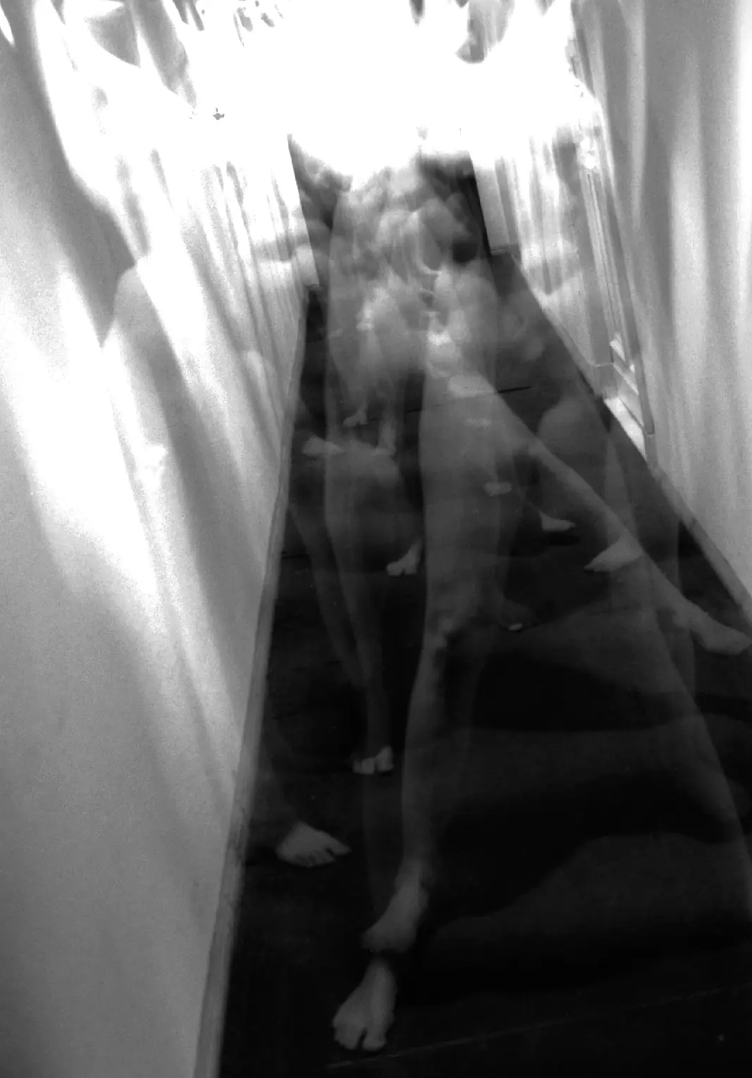 Analoge Mehrfachbelichtungen zeigen Körper, die sich vervielfältigen, verschieben und teilweise verschwinden. In der Überlagerung entstehen Szenen flüchtiger Identitäten – ohne feste Umrisse zwischen Sichtbarkeit und totaler Auflösung, weil sich die Zeit in das Bild einschreibt. Die analoge Herangehensweise verhandelt Sichtbarkeit als fragilen Zustand. Es erscheinen Fragmente von Körpern, die in einem einzigen Moment entstehen, um gleich darauf in einzelne Schichten zu zerfallen. Es wird somit das vorweggenommen, was digitale Systeme von Beginn an prägt: das Verschwinden des Körpers in Ansammlungen von Daten und algorithmischen Erfassungen.