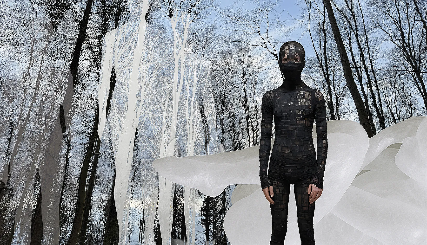 Two bodies embody different modes of withdrawal: one shrouded in black, closed off, as a form of resistance against algorithmic surveillance; the other white, translucent, almost dissolved. Between resistance and dissolution, an ambivalent field of visibility emerges. Presence is revealed here not as a stable form, but as movement – between control and withdrawal, between the desire to be recognised and the right to remain invisible.