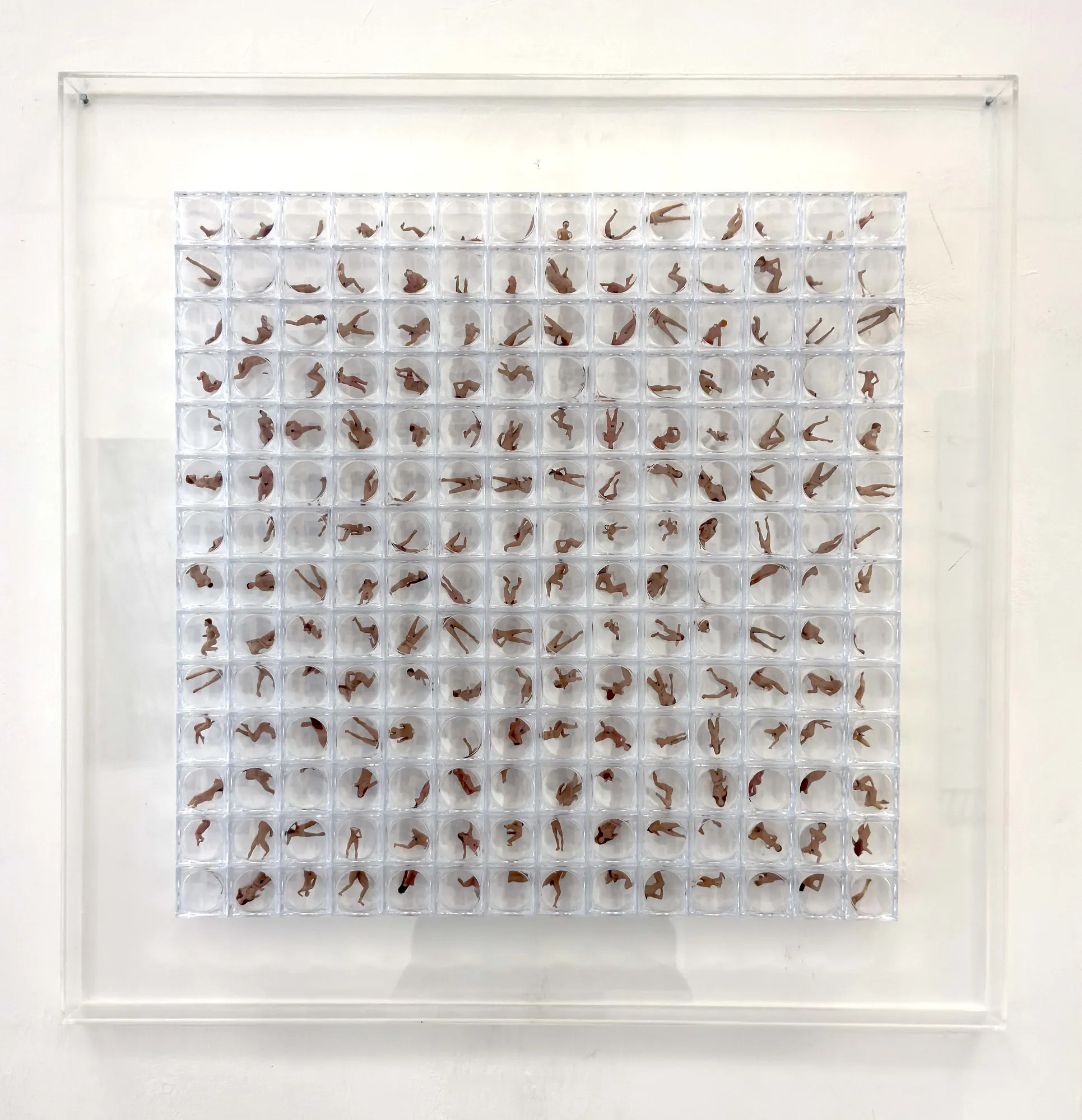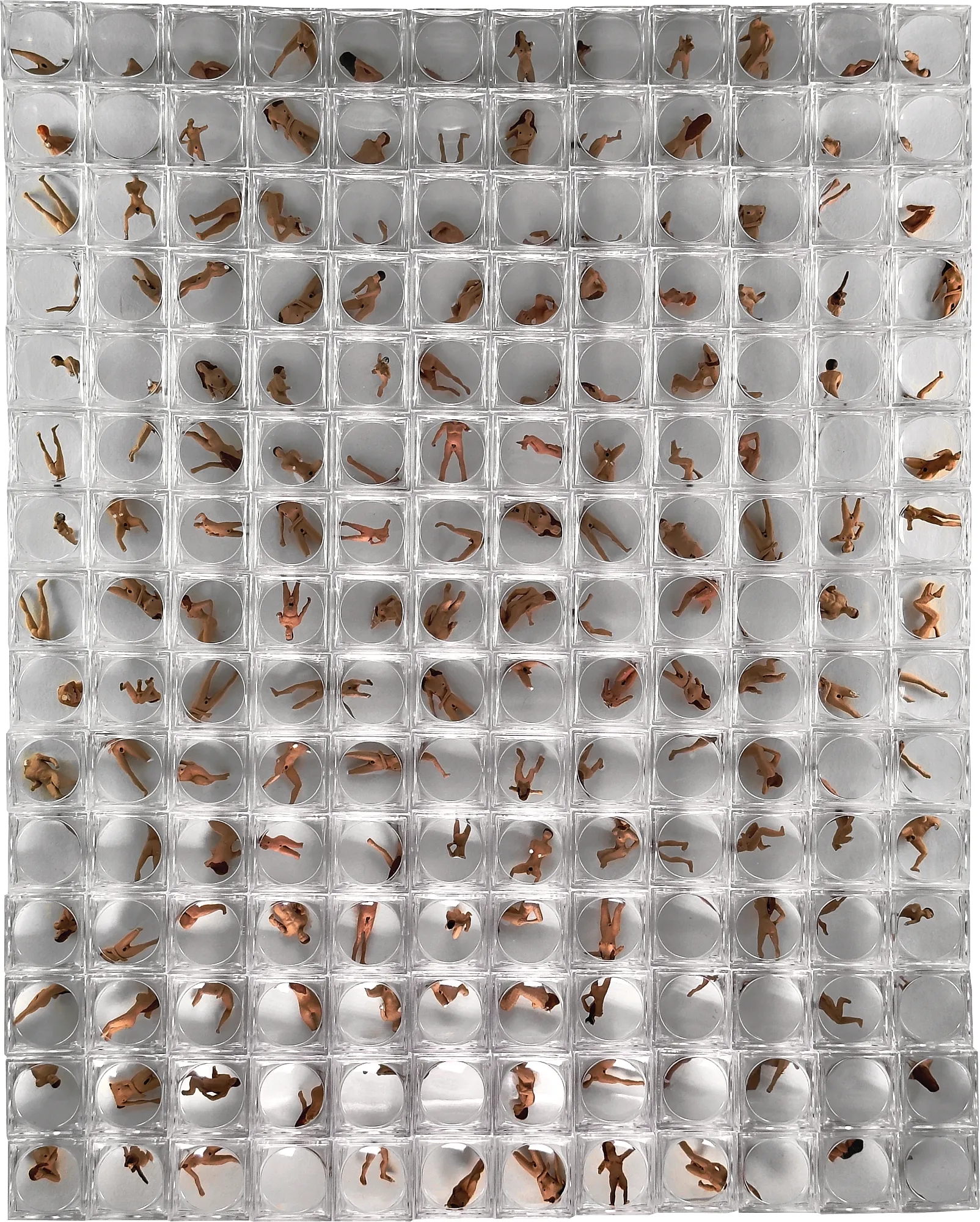 Bodies are arranged in transparent cases reminiscent of a scientific archive. They appear identical, fixed and preserved. Only through magnifying glasses does it become apparent that essential parts are missing – arms, heads, body fragments. What appears complete from the outside is revealed to be incomplete and damaged. A paradoxical presence thus emerges: the bodies are displayed like exhibits. Visible as objects in a grid. Yet as subjects they remain absent – without a voice, without singularity. Vanished as objects in the grid.