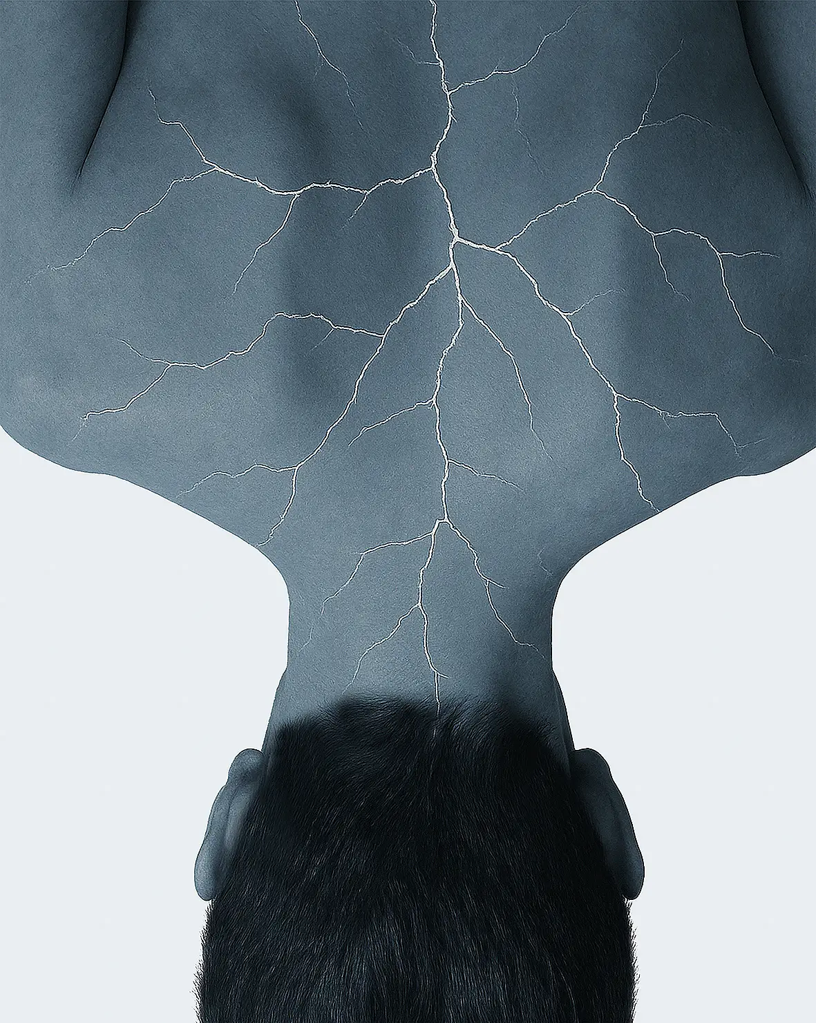 A vertically mirrored back, covered in fine lines. A network of connections reminiscent of veins, fractures or cartographic traces. Tension and structure intertwine. No face, no clear ‘I’ – just a structure that supports and simultaneously fragments.